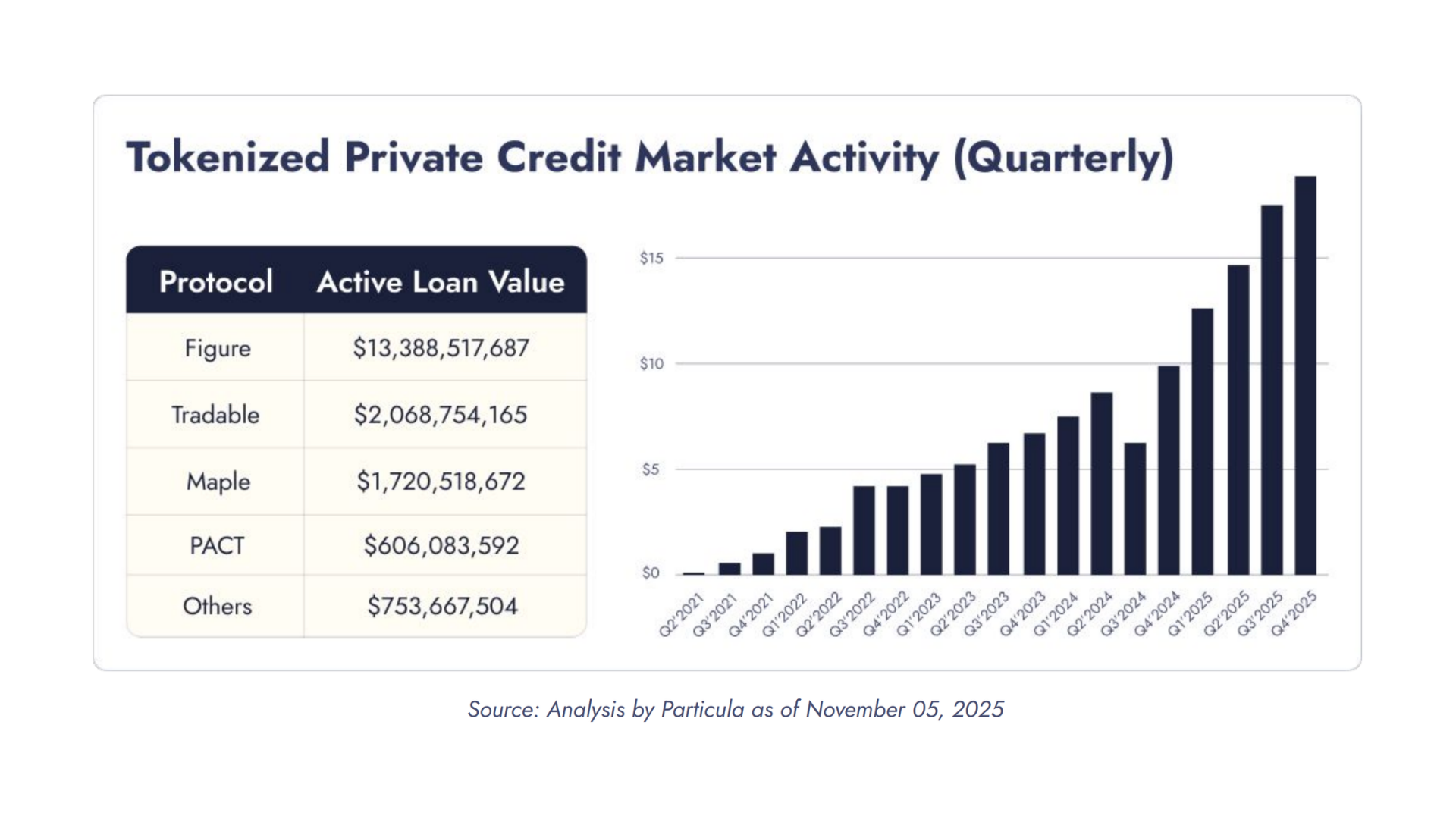 The growth trajectory is hard to ignore. Tokenized assets have expanded from a niche experiment to a market exceeding $17 billion in tokenized private credit alone, up from $4.1 billion in December 2022.